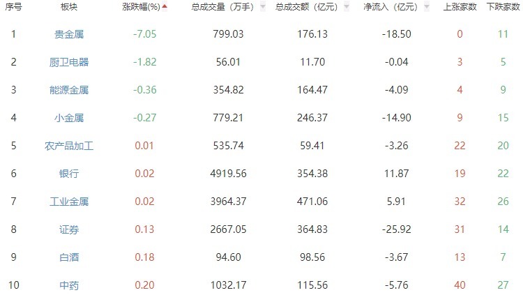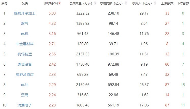 板块方面,煤炭开采加工、燃气、电机等涨幅居前,贵金属、厨卫电器、能源金属等跌幅居前。